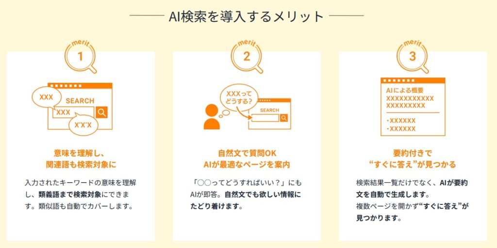 文章でそのまま質問できること、類義語や表記ゆれを含めて探してくれること、検索結果に要約が出ることで複数ページを開かずに答えの方向がわかること、これらは機能の話ですが、根本的には「外の検索で育った期待値に、自社サイトが応える」ことを目的にしています。
