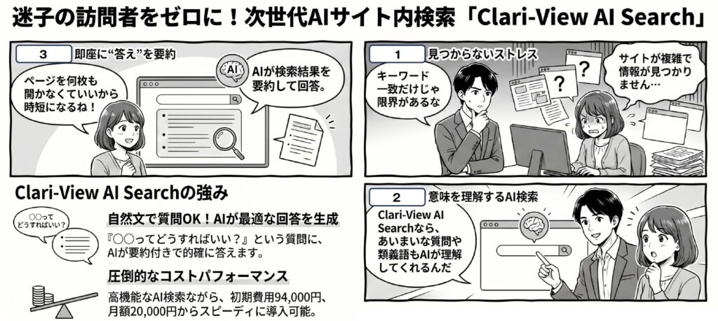 弊社の『Clari-View AI Search』は、自社サイト内に、外の検索と同じような体験を設けるためのサービスです。