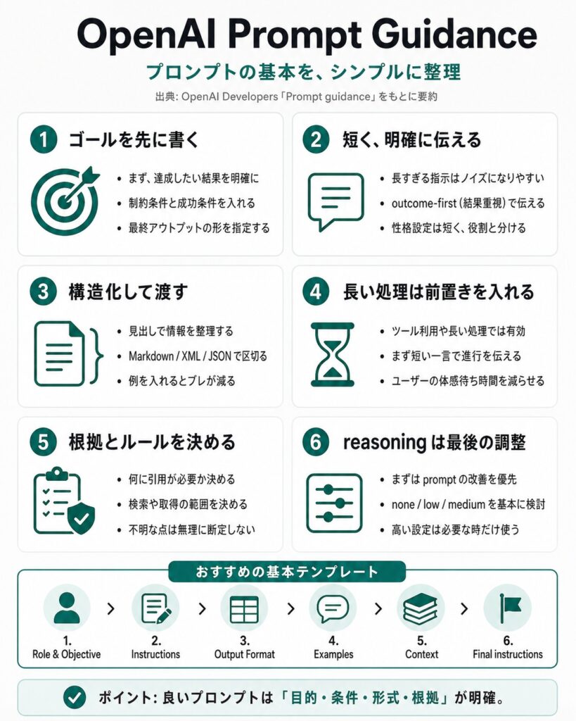 あと、OpenAIは2026年4月24日、プロンプトガイド「Prompt guidance」を公開しました。以下にまとめておきましたので、参考にしてみてください。