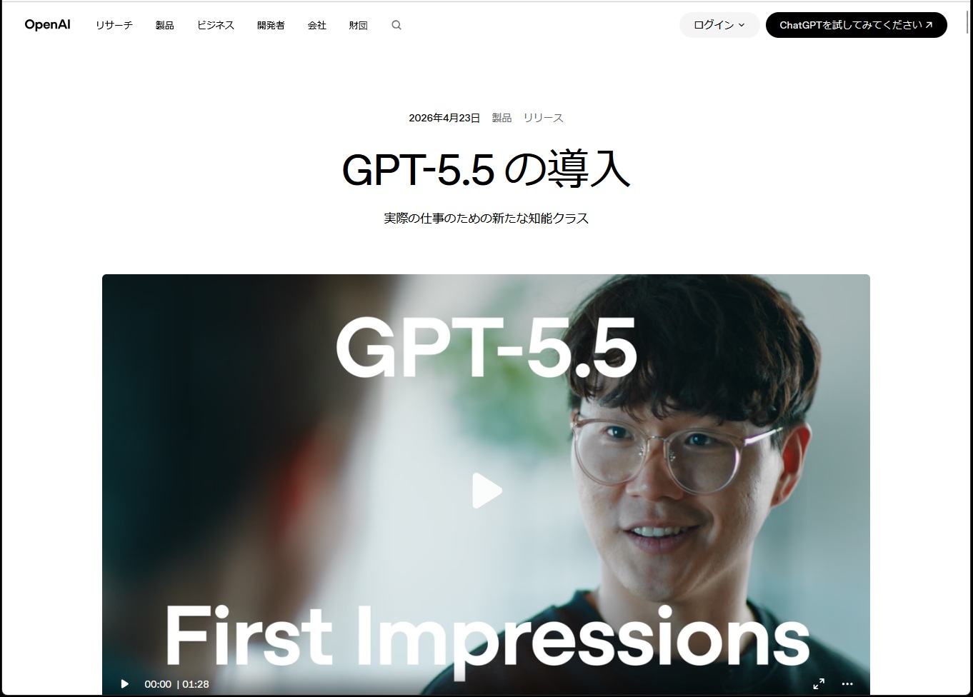 やや出遅れた感はありますが、OpenAIが2026年4月23日、「GPT-5.5」を発表しましたので、公式発表をベースに要点をまとめておきたいと思います。このモデルはビジネスの現場に直結する内容ですので、ぜひ最後までお読みください。