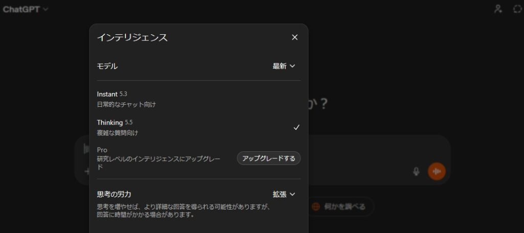 また、速度と賢さを両立している点も大きな特徴です。高度なAIモデルは一般的に処理が遅くなりがちですが、GPT-5.5は前のバージョンと同等の速さを保ちながら、はるかに高い知性を実現しています。 OpenAI・・とありますが、経験上、発表直後は良くても、時間経過とともに計算リソースが足らなくなっているのかな?って思うくらい、速度が落ちていることがあります。もしかしたら気のせいかもしれませんが、個人的には期待しすぎないようにしています(笑)