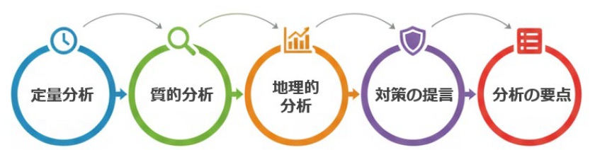 そこで『アニマルアラート インサイト』では、定量分析、質的分析、地理的分析、対策の提言などを考察項目とし、今後の対策アクションを明確にすることで、地域住民の安全を守る、重要なツールとなります。