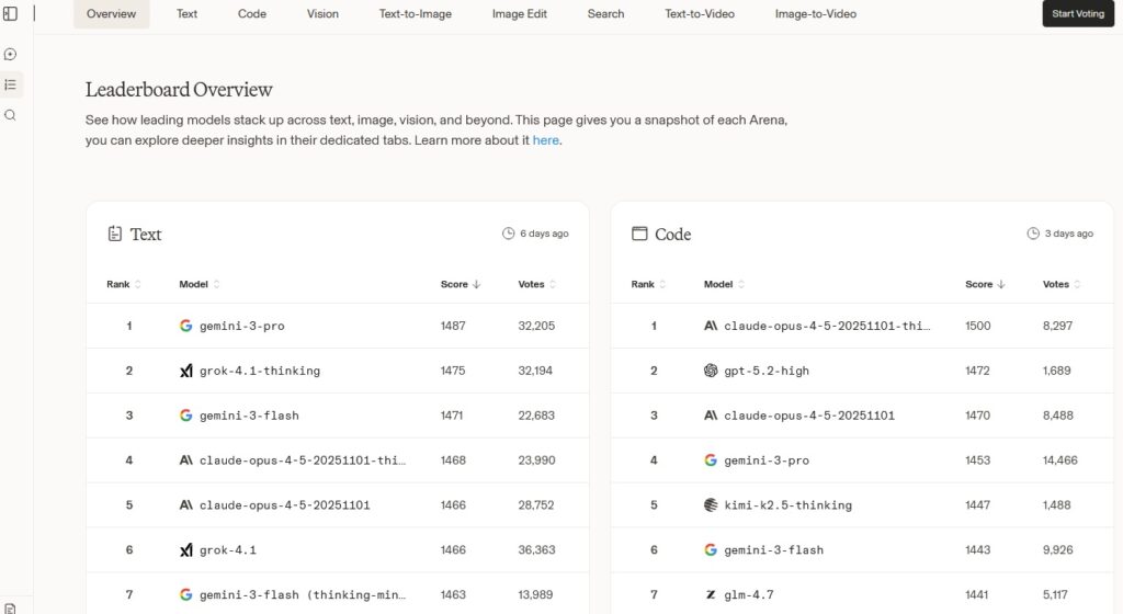 - 「Text」「Code」「Vision」「Text-to-Image」「Text-to-Video」など、カテゴリ別に順位が並ぶ