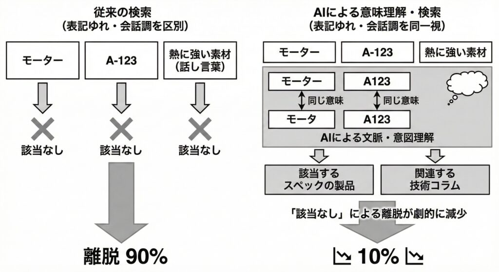 「モーター」と「モータ」、「A-123」と「A123」を同じ意味だとAIが理解します。また、「熱に強い素材」といった話し言葉のような検索に対しても、該当するスペックの製品や関連する技術コラムを提示できるようになります。これにより、「該当なし」による離脱が劇的に減少します。