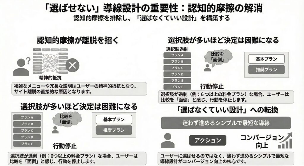選択肢が多ければ多いほど意思決定が困難になり、最終的には何も選ばないという結果を招くことになってしまいます。たとえばECサイトで商品を1,000件を一覧表示するだけでは、購買率が上がらないことくらいわかりますよね。サブスクを提供するWebサイトでも、プライシングページに料金プランを6種類並べると、おそらくユーザーは悩み、「面倒だな・・」と思って申し込まずにページを閉じる可能性は高いです。「選ばせる設計」ではなく「選ばなくていい設計」こそが、導線設計の核心にあると私は思います。