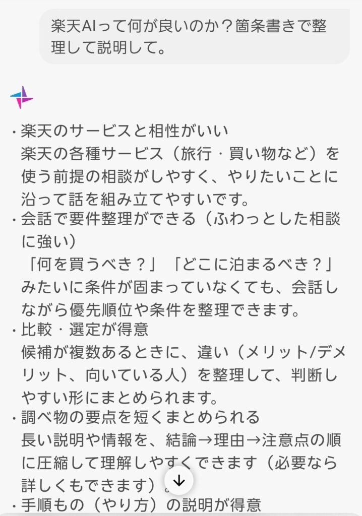 デメリットとしては、他のECサイト(例えばアマゾン)で「〇〇を買いたい」と入力すると、“申し訳ありませんが、他社サイト(アマゾンなど)での購入についてはご案内できません。楽天市場でも多彩な〇〇が揃っています・・”などと出てきますので、あくまで楽天サービス向けのエージェントAIと言えますね。