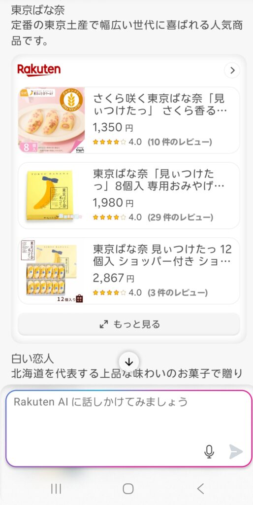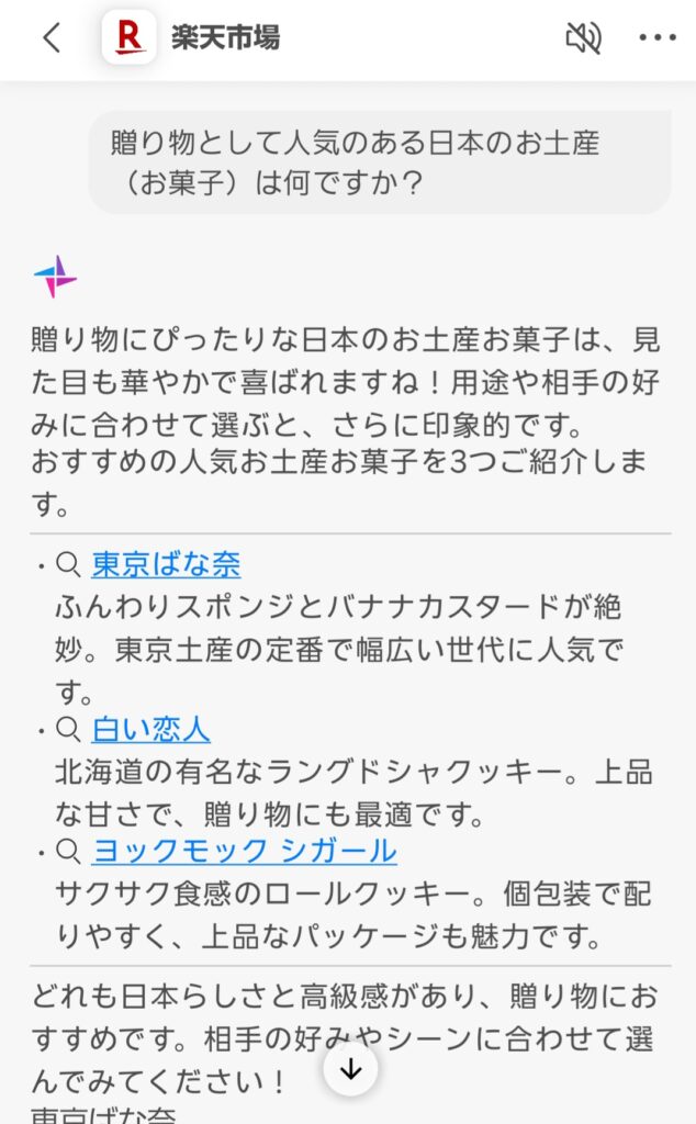 「贈り物として人気のある日本のお土産(お菓子)は何ですか?」を試すと、数秒でフラワーアレンジメント・入浴剤セット・おしゃれなハンドクリームなど、いくつかの候補を提案してくれました。 それぞれに「なぜおすすめか」の理由も添えてあり、親切さを感じました。