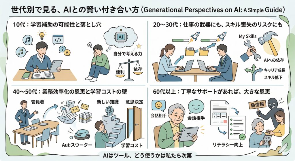 生成AIは万能なツールではありませんが、世代ごとのニーズや生活スタイルに合わせて上手に活用することで、学習・仕事・日常生活の質を大きく向上させる可能性を秘めています。大切なのは、AIをただ「便利なもの」として受け入れるのではなく、その仕組みや限界を理解しながら、自分の目的に合った使い方を見つけることではないでしょうか。